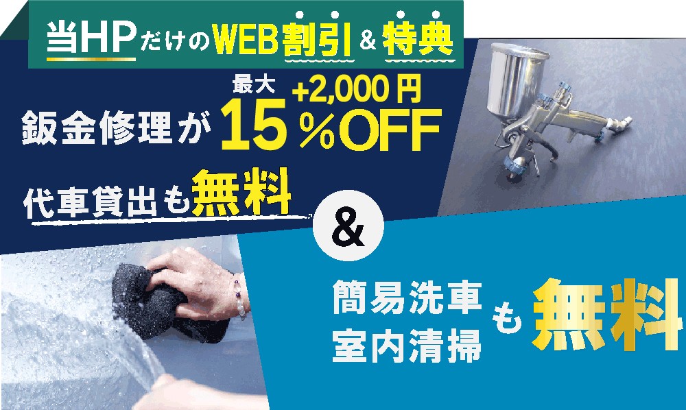 スズキアリーナ行方店では、代車が不要のお客様に限り、板金修理工賃より2,000円割引させて頂きます。