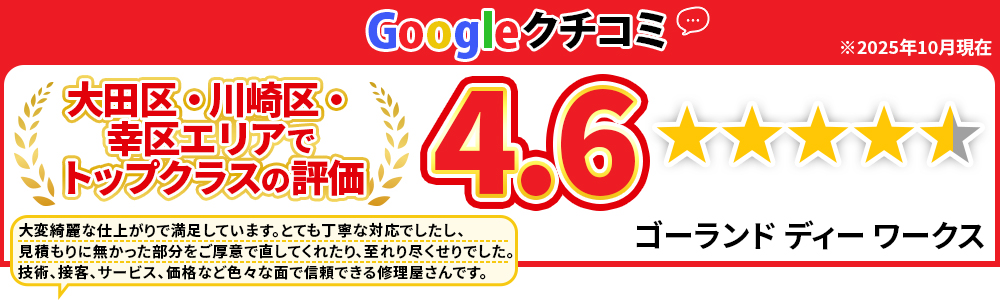 利便性を追求して、大田区・品川区・川崎市幸区・中原区エリアのお客様のご要望に応じた対応を心掛けております!当店に板金をお任せ頂いたお客様には、代車を無料でレンタル致します!板金作業中のお出掛けも、代車でラクラク!