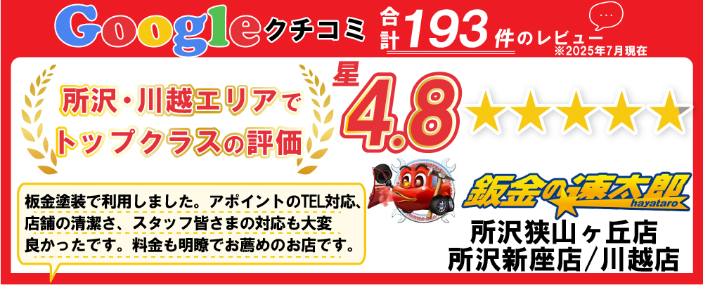 鈑金の速太郎所沢新座店/所沢狭山ヶ丘店/川越店では地域トップクラスの信頼と実績!年間1,400台の鈑金実績/安心の保証付き!代車も無料!/見積もりだけでも大歓迎!驚きの低価格32,725円~