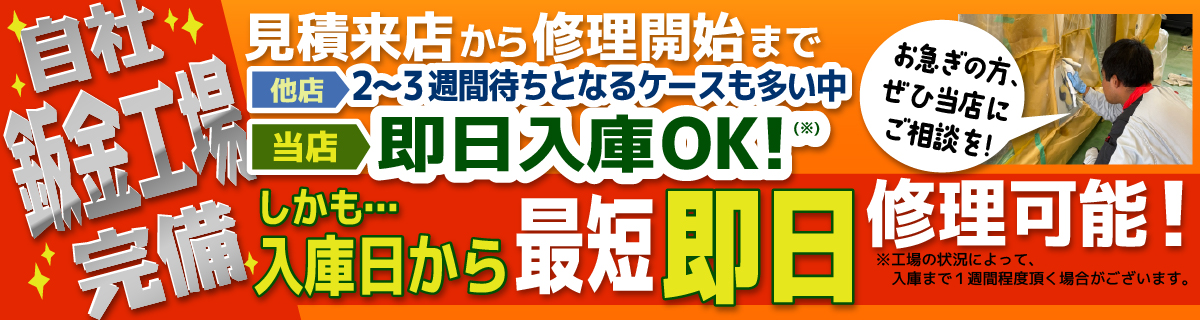 長年積み重ねてきた板金の経験やノウハウによって、お車を何日もお預かりせずに修理が完了できるようになりました。 バンパーのキズ修理なら最短3時間完了!バンパー補修以外でも、数日でお引き渡しが可能です。お車のキズ修理の概算修理期間や金額を知りたいお客様は、お電話またはメールにてお問い合わせください。
